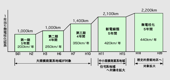 ※1 海外の都市は電気事業連合会調べによる1977年の状況(ケーブル延長ベース) ※2 日本の状況は国土交通省調べによる2008年3月末速報値(道路延長ベース) ※3 幹線(幹線道路):市街地の一般国道、都道府県道 |